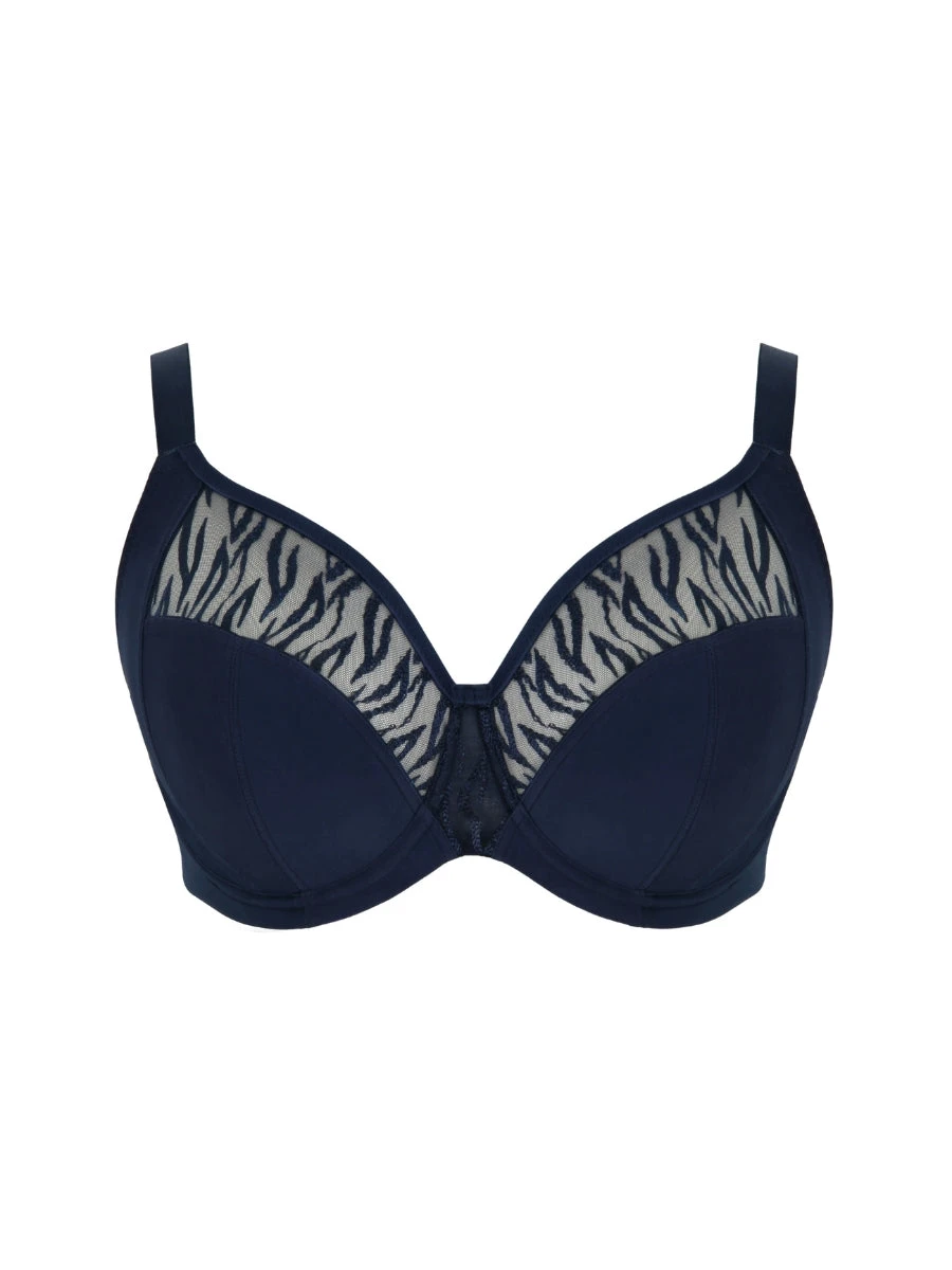 Elevate your lingerie collection with the luxurious Alexa Full Cup Bra in Navy from Sculptresse by Panache. Designed for comfort and support, this underwired bra features a four section cup and side support for flattering forward projection. The elegant semi racer back style ensures that the straps are centred for added comfort. Whilst the rigid animal print inspired embroidery creates a subtle hint of sensuality.