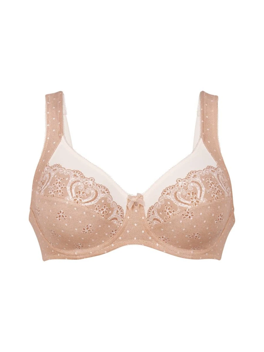 Indulge in sophistication with the Anita Belvedere Underwired Comfort Bra. This luxurious bra from the renowned brand Anita provides unparalleled support with its underwired design and padded comfort straps. The full cup and two part cup construction, along with delicate embroidery details, make for a comfortable and stylish fit. The Powder Peach colour over a polka dot base adds a touch of elegance to this must-have bra.