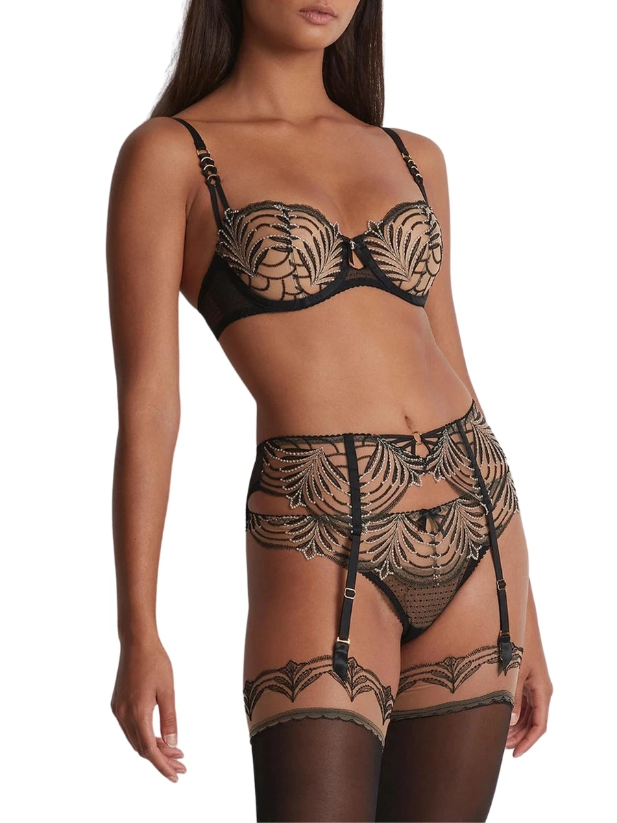 Add a touch of glamour to your lingerie collection with the Hypnolove Tanga. This exquisite piece is crafted with sheer tulle adorned with graphic embroidery, elegant crystal diamanté, and bondage-style lacing for an exquisite look. Exude confidence and charm with this luxurious piece.