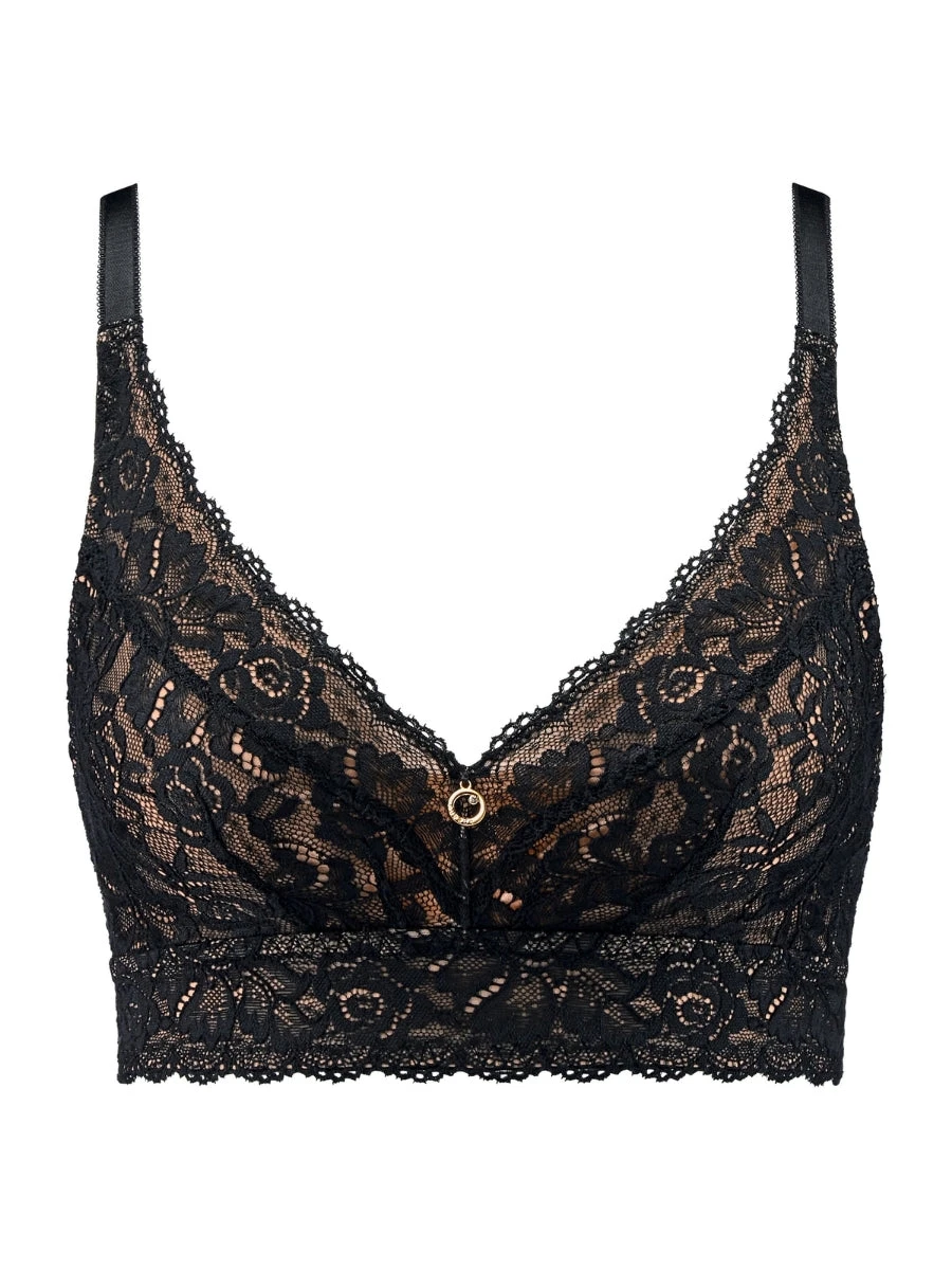Indulge in luxury with the Rosessence Care Triangle Bralette by Aubade. Non-wired for maximum comfort, this bralette features delicate lace details that add an elegant touch. Perfect for everyday wear, elevate your lingerie collection with this sophisticated piece in a chic Black colourway.