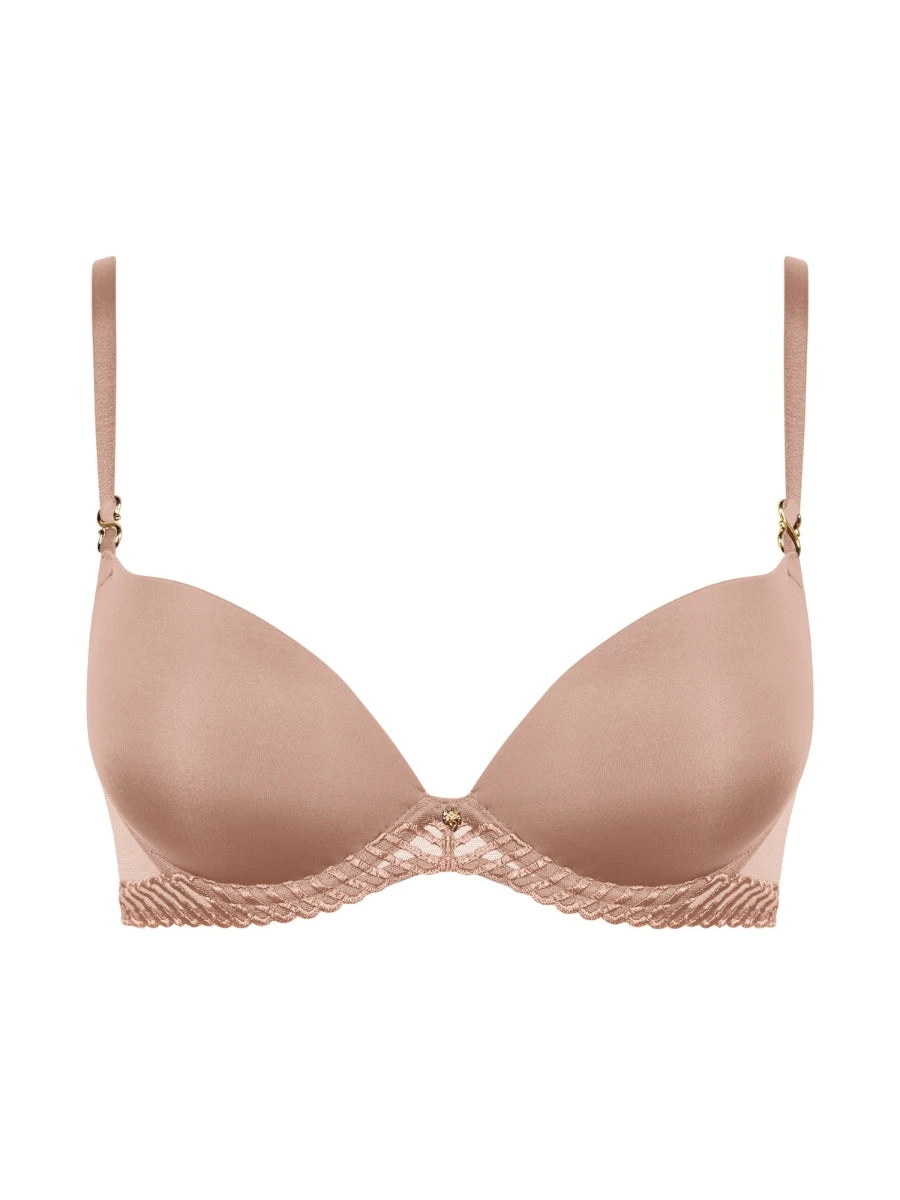 Indulge in the Sheer Emotion Moulded Push-Up Bra in Sand. Offering an enhanced cleavage with lightly padded cups that create a natural push-up effect,. Whilst the plunging neckline and smooth moulded cups provide comfort and support. The intricate graphic embroidery and sheer tulle back add a touch of luxury, making you feel like a work of art.