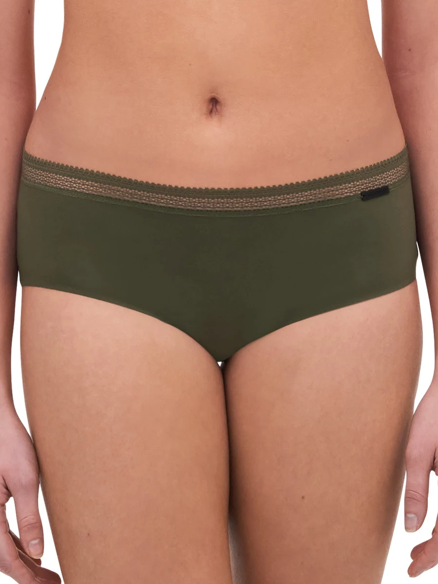 Chantelle Period Pants, a new must have for comfort, every single day. Designed with an eco friendly mindset, these graphic mid rise hipster period pants are made from organic cotton and recycled microfiber. This brief features anti odour, moisture wicking fabrics and a seamless quality lace trim. Perfect for wear up to 12 hours, based off a heavy menstrual flow. Available in Black and Khaki.