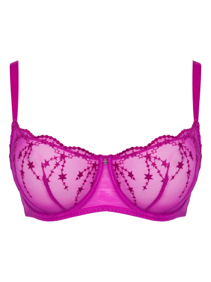The Stardust Balcony Bra in Vivid Violet by Curvy Kate combines expert design with elegant details. Featuring underwired support and uplifting vertical seams, this non-padded balcony bra shapes and lifts naturally. Crafted from soft sheer mesh, it offers breathable comfort, while shimmering star embroidery adds a delicate, celestial touch. Ideal for those seeking both style and structure in their lingerie collection.