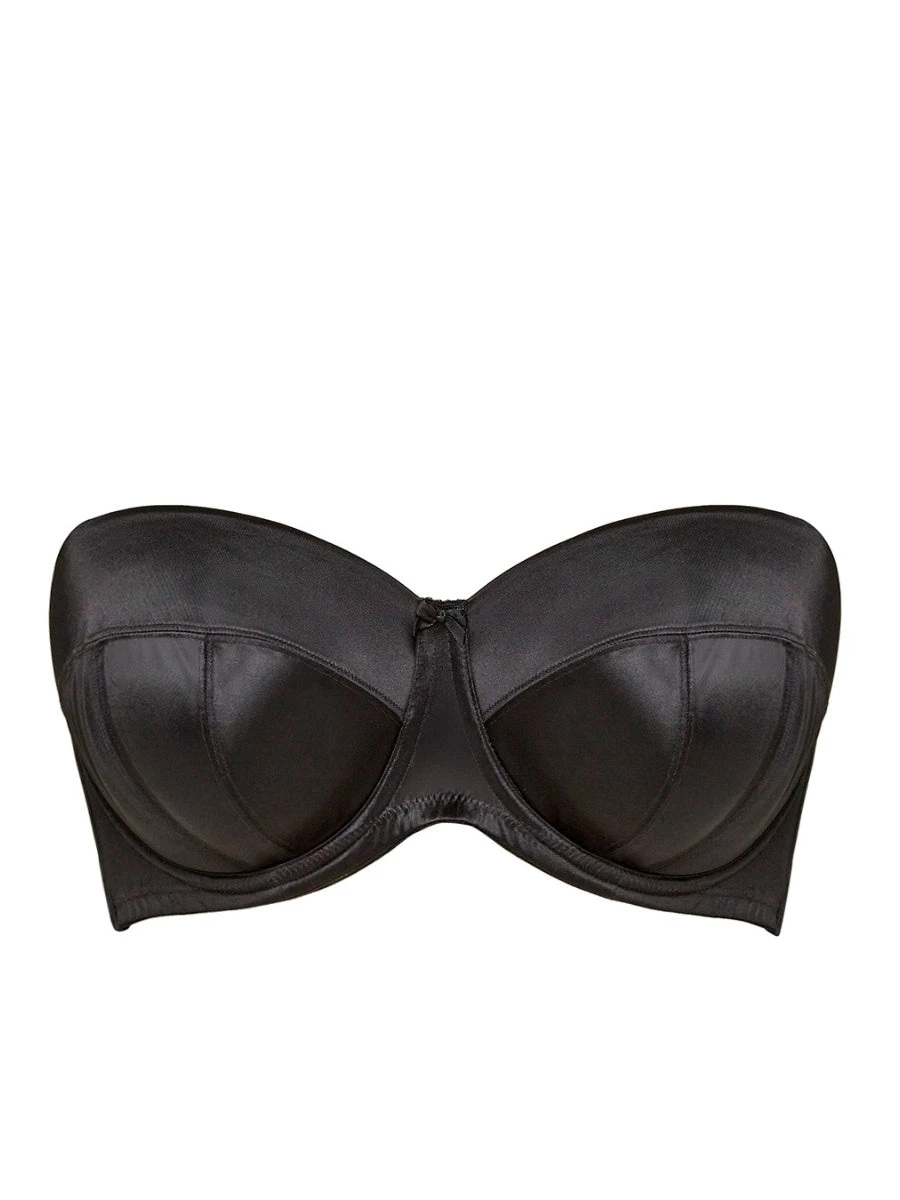 Introducing the Dana Balcony Strapless Bra in Black from Sculptresse by Panache. With a supportive four piece padded cup and silicone elastics, this bra stays in place all day long. The detachable multiway straps offer versatility for any outfit, while the wide back band and double layer wings provide extra softness and a smoothing effect. Feel secure and uplifted without straps, thanks to the plastic bones in the side seams. Elevate your lingerie collection with this luxurious and exclusive piece.