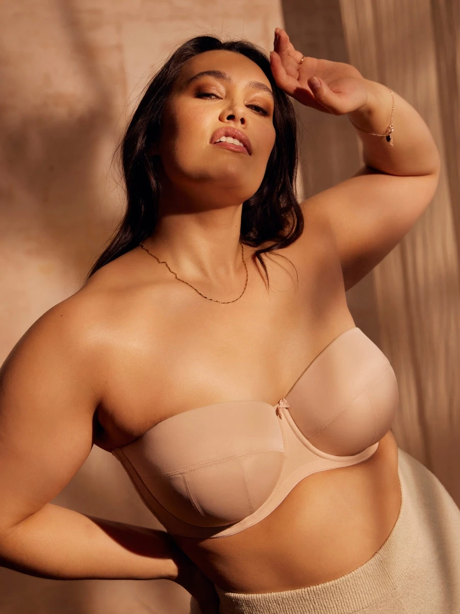 Introducing the Dana Balcony Strapless Bra in Linen from Sculptresse by Panache. With a supportive four piece padded cup and silicone elastics, this bra stays in place all day long. The detachable multiway straps offer versatility for any outfit, while the wide back band and double layer wings provide extra softness and a smoothing effect. Feel secure and uplifted without straps, thanks to the plastic bones in the side seams. Elevate your lingerie collection with this luxurious and exclusive piece.