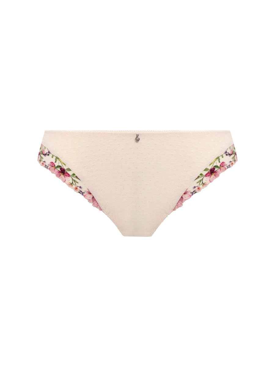 Indulge in luxury with the Marie Thong by Fantasie. Featuring a mid-rise design and soft handle fabric, it provides a second skin feeling. Intricate printed embroidery evokes a summer garden, while the gem charm in the center adds a touch of elegance. Say goodbye to visible panty lines and hello to sophistication.