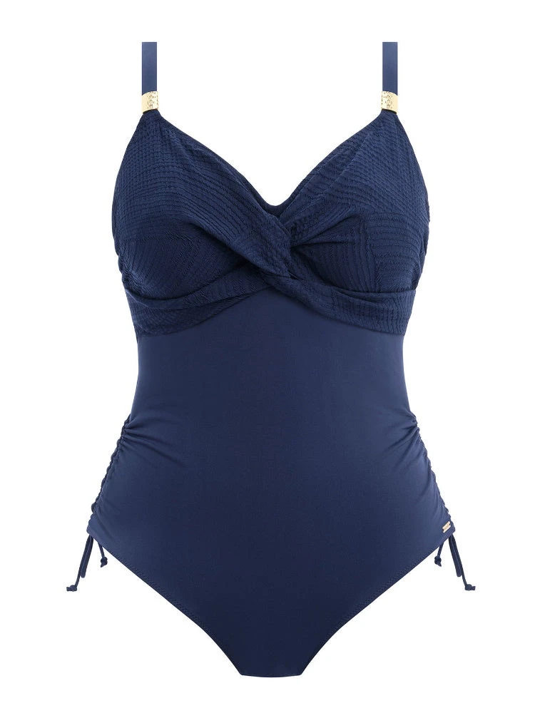 Fantasie Ottawa Swimsuit in Ink- This gorgeous swimsuit is every woman’s dream! Create your desired silhouette with the adjustable drawstring ties on either sides of the waist to hide those unwanted bulges, giving you a smooth figure. Built in underwired non padded cups to for a natural uplift. Elasticated leg opening and fully adjustable straps for the upmost comfort. The twist like wrap on the front of the cups gives the illusion of a forward projection offering a beautiful strong posture. Polished with metal sliders detailed in the straps with the Fantasie logo placed on the bottom front . Buy this for an effortless elegant look. Make sure you check out the rest of the Ottawa range!