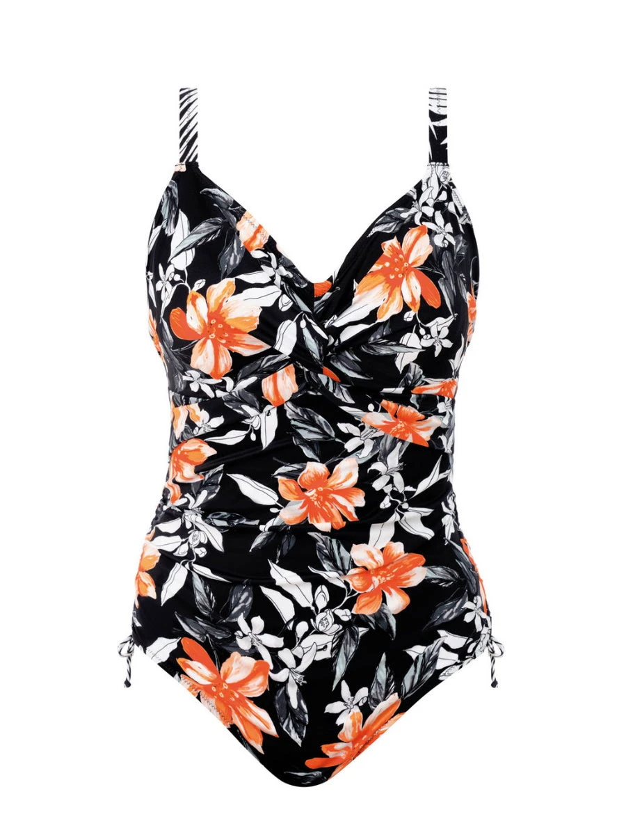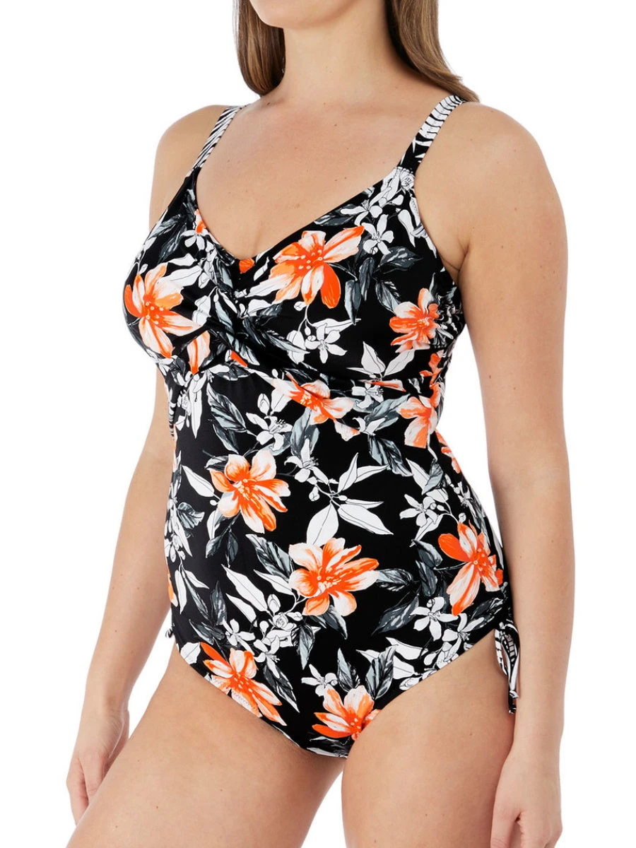 Indulge in luxury with the Fantasie Port Maria Twist Front Swimsuit in classic black. Its adjustable side ties allow for a flattering ruching effect, while the concealed upper back lining offers support for a perfect fit. Fixed fully adjustable contrast print straps and a concealed underwire add to its exclusive design.
