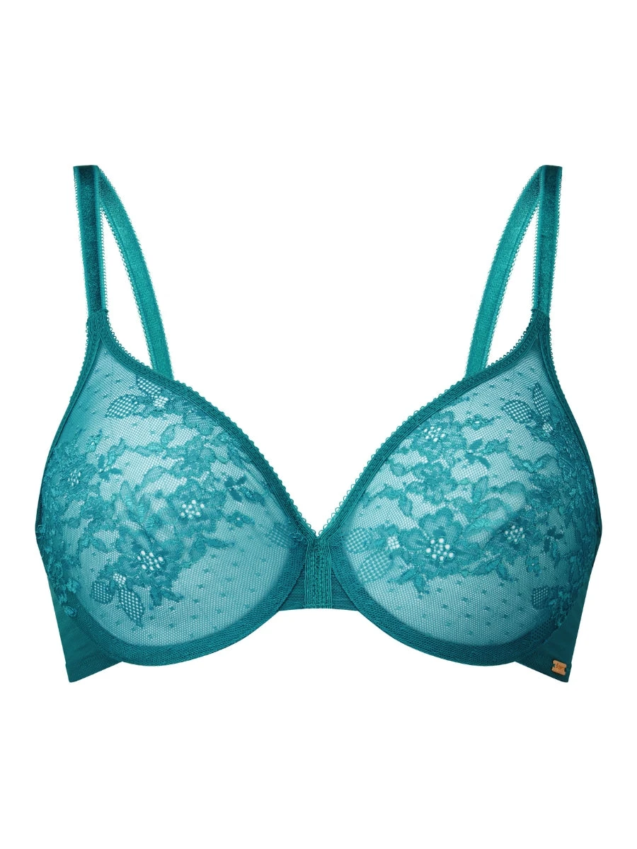 This Sheer Bra in Deep Teal offers a deep plunge neckline and seamless, moulded cups. Finished with a gold signature plate detailing. Matches perfectly with either the Glossies Lace Thong or the Glossies Lace Brief.
