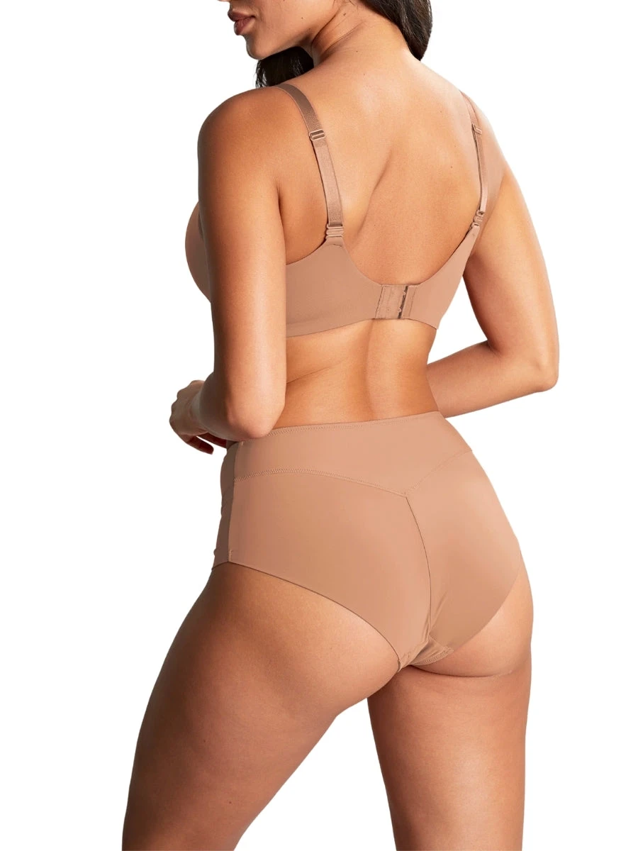 Introducing the 365 Moulded T-Shirt Bra by Panache in charming shade Honey. A luxurious t-shirt bra featuring underwired, lightly padded cups for everyday support. The flexible underband moves with you, while the cross-over straps allow for multiway wear. Bonded neckline and underarms provide a smooth and seamless appearance. Made with recycled yarns, this is the perfect everyday bra for a sustainable and sophisticated wardrobe.