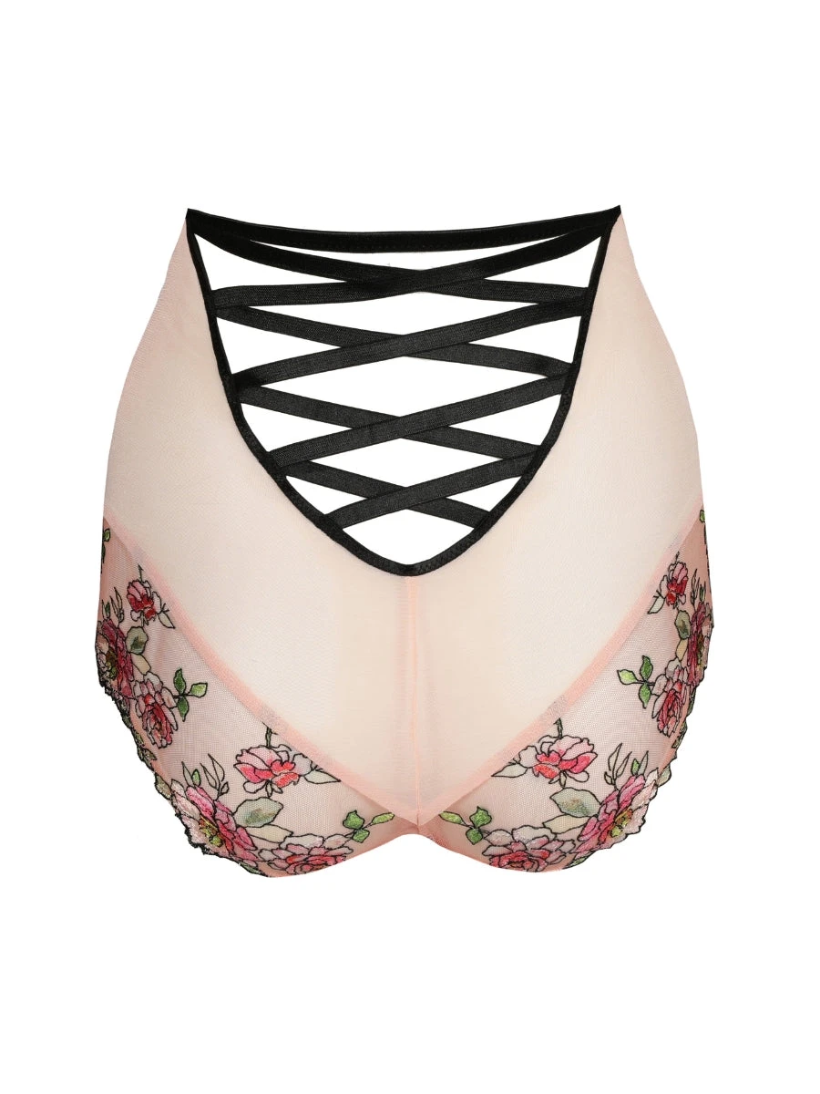Introducing the Eraclea Special Brief, from the luxurious brand PrimaDonna. Elevate your lingerie collection with these high-waisted briefs featuring exquisite floral embroidery and a striking contrast of black and soft peach. The corset inspired lace-up detail in the back adds a touch of something truly special.