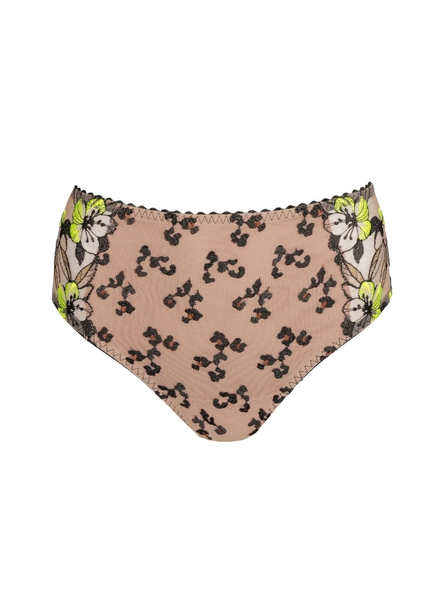 Experience the Manali Full Brief by PrimaDonna, a luxurious lingerie piece combining full coverage with a high-waist silhouette for ultimate comfort and support. Featuring exquisite leopard print and neon floral embroidery on a nude illusion base, this design offers a striking, sophisticated look. Perfect for those seeking elegance and confidence in everyday wear.