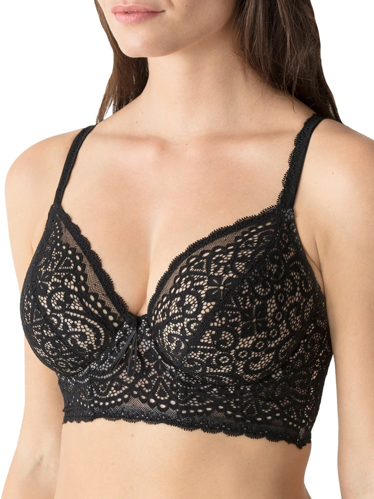 This Primadonna Twist longline plunge bra is fashioned from luxuriously soft, stretch corded lace for a captivating and seductive look. The semi-sheer scalloped edge cups and plunge neckline highlight your breast and enhance your cleavage for a sensual, smouldering effect. A beautifully lined bottom cup supports the non-padded cups for extra comfort. The lovely longline feature is lined and incorporates softly covered bone to support the side seams and underneath the cups. Features a five-hook and three-row closure, soft back adjustable satin straps, and a lovely satin bow in the centre.