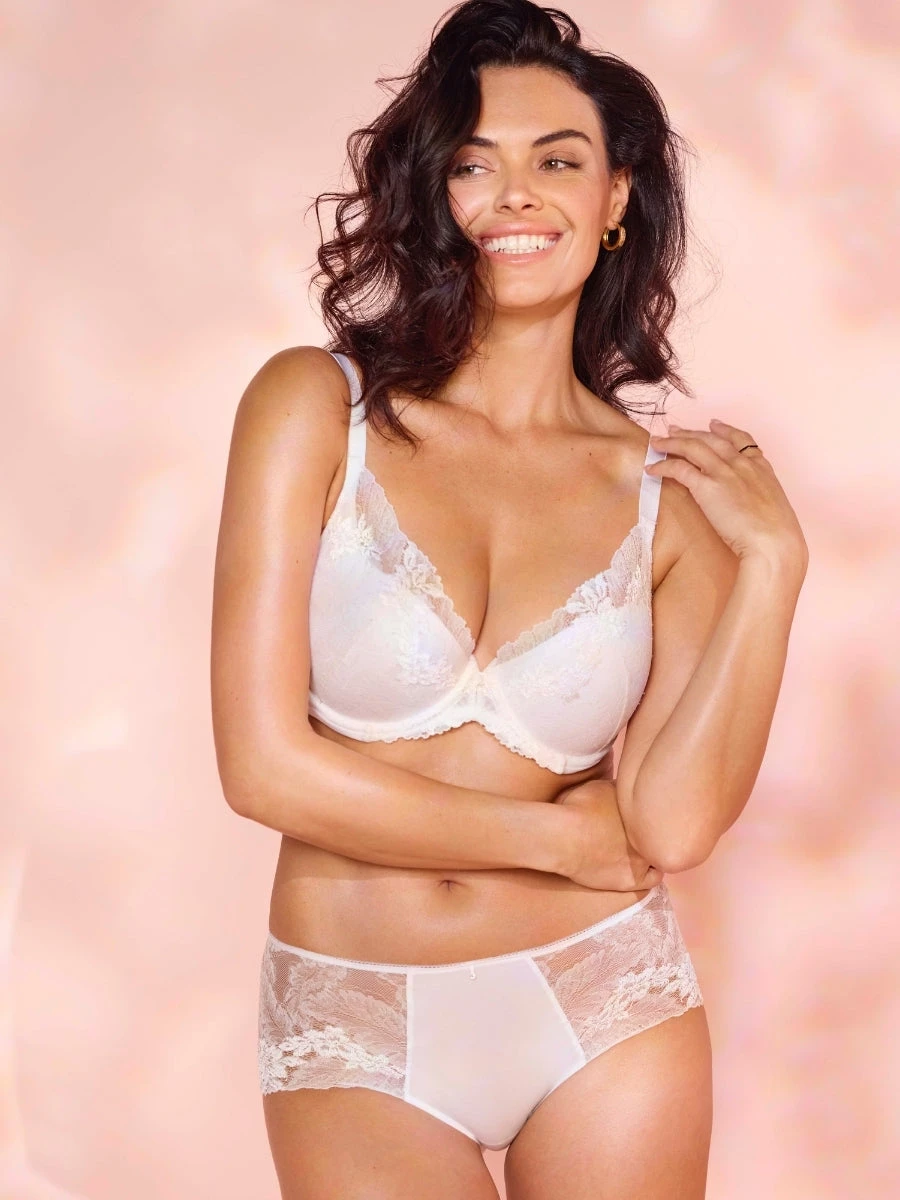 Indulge in the Most Divine Plunge Bra by Wacoal, exquisitely designed with a high apex stretch lace overlay and graduated foam moulded cups for subtle uplift and a luxurious push-up effect. The soft microfibre wings, delicate floral lace details, and classic White color make this plunge bra a romantic addition to your lingerie collection.